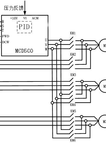 檢修,選用一臺(tái)MCD500系列110KW變頻器,配置一套PLC控制器,完成該水廠恒壓變頻自動(dòng)控制。
