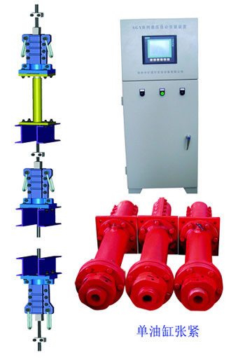 在正常情況下,罐道繩的拉緊力由液壓缸上部的雙楔塊固緊器傳至液壓缸活塞桿上,借液壓缸傳遞到液壓缸壁上,通過液壓缸壁再把拉緊力由液壓缸法蘭盤傳遞到固定液壓拉緊裝置的樓板或梁上。