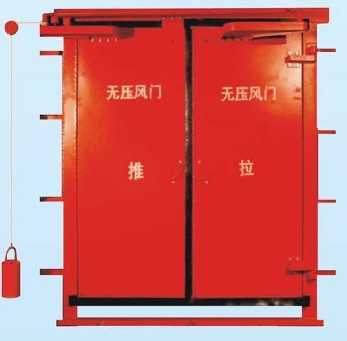 無壓風門是目前我國煤礦井下風門較為理想的一種,它打破了老式風門的結構形式,巧妙地運用聯(lián)桿平衡機構,把作用在風門上的負壓通過平衡機構轉化為一種內力,使得風門開啟只與配重及門軸摩擦阻力有關。開啟方式:手動操作。