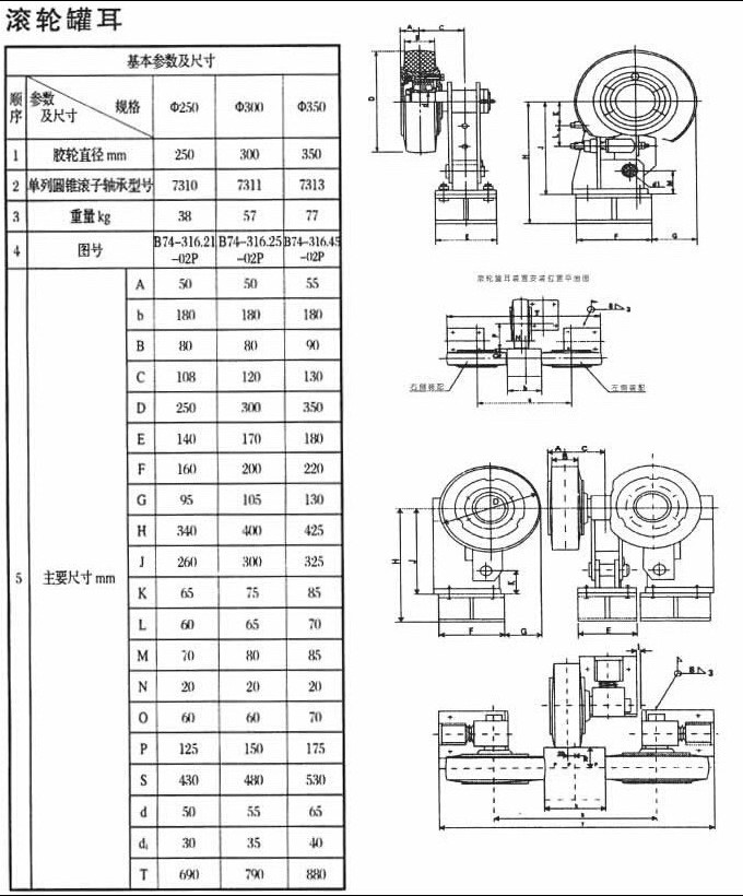 滾輪罐耳主要由輪軸、支架、緩沖裝置、底座等組成。